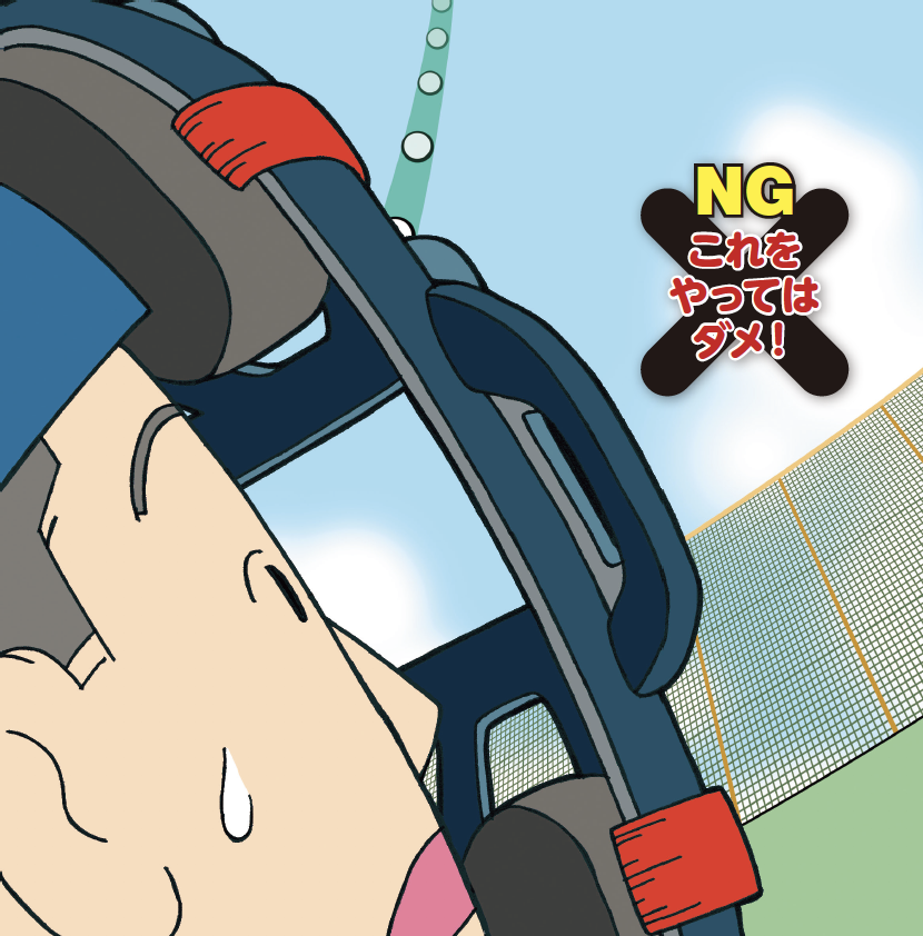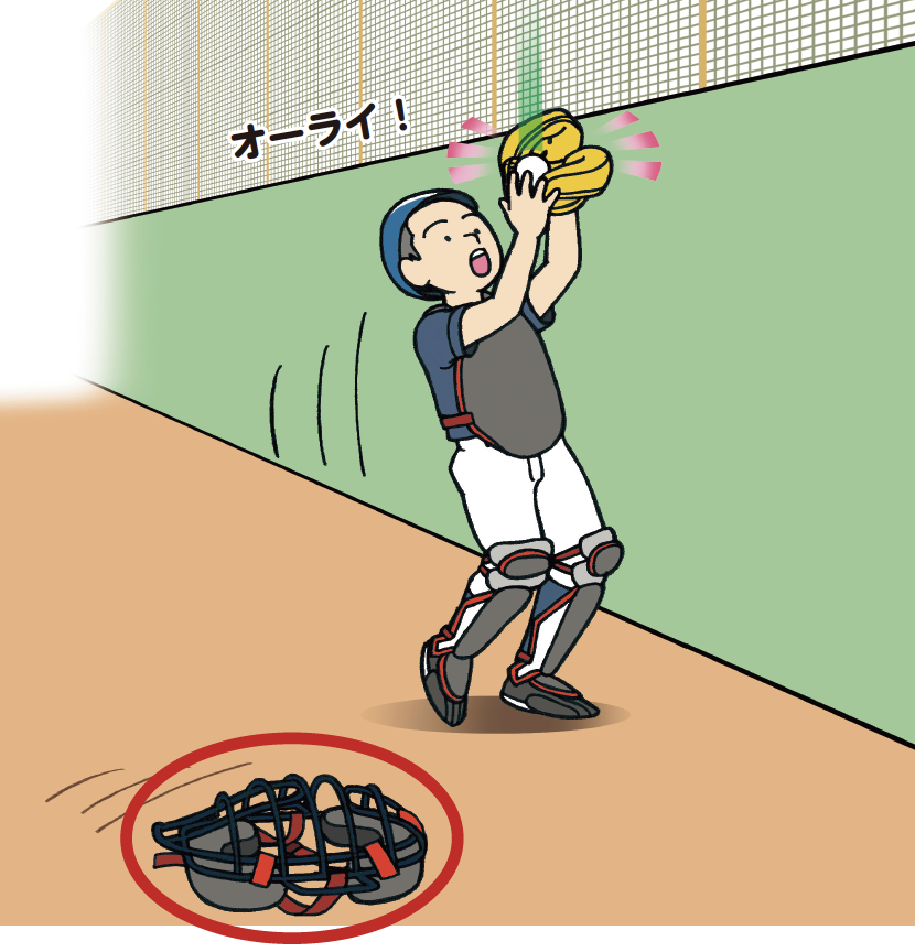 打球を追うときに、マスクが動きの邪魔になるだけでなく、網の部分はボールを追う視界の妨げになる。動くことでマスクがずれたりするとなおさらだ。キャッチャーフライが上がったときには、ボールが見えなくなった瞬間にマスクを外して、真上を見上げるまでを一連の動きとして習慣づけよう。視界で捉えられる、中途半端に上がったフライは素早い捕球動作が必要なので、マスクをつけたまま捕りに行こう。