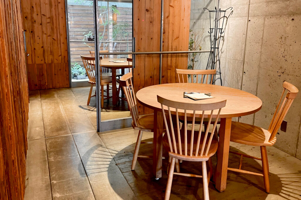店内をさらに奥に進むとコンセントが使えるカウンター席があり、丸テーブルも配置されています。この空間はガラスの仕切り扉を閉じることで、半個室のように使えるのだとか。