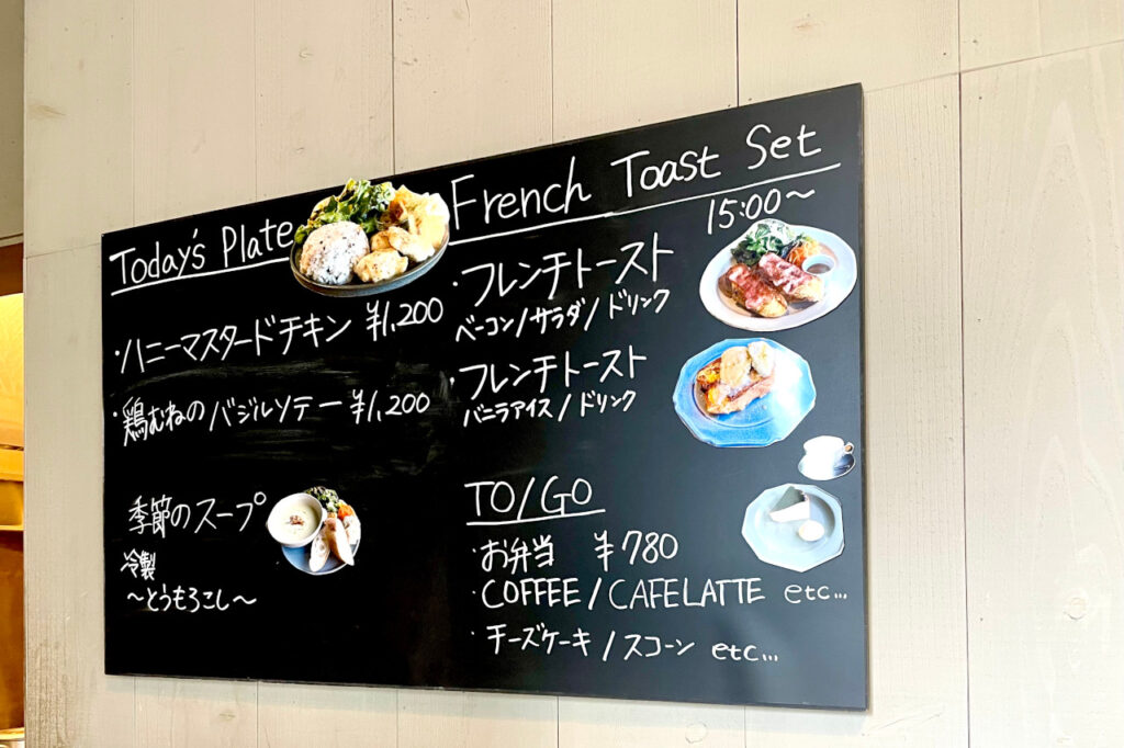 この日のランチメニューは、チキンのプレートランチが2種類と、季節のスープランチが1種類。ハニーマスタードチキンのプレートランチは定番メニューとして、ほぼ毎日提供しているのだとか。 カフェメニューやドリンクも豊富に揃っており、特にバスクチーズケーキが人気だそう。