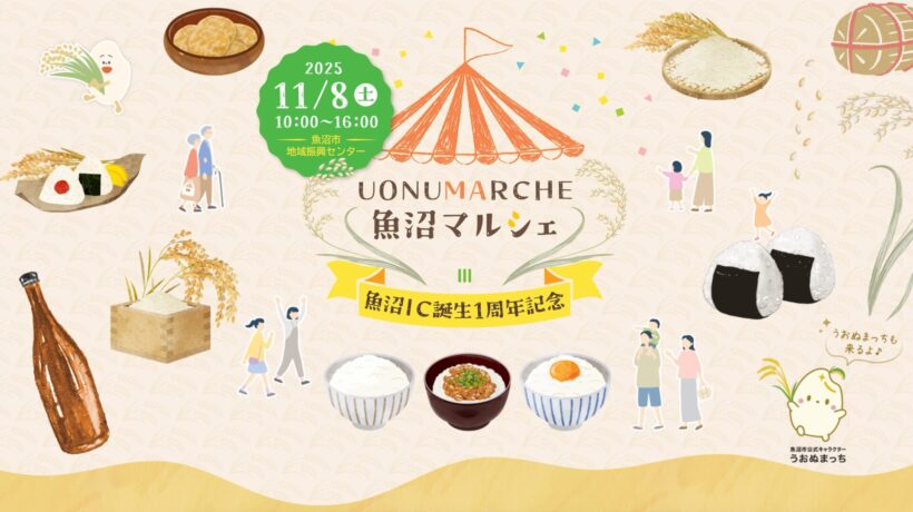 新潟県魚沼市で11月8日、新米おにぎりの配布や縁日、市内のお土産の販売などを行う「UONUMARCHE(魚沼マルシェ)」が開催される。会場は、魚沼市地域振興センター2階のコンベンションホール。開催時間は、10時から16時まで。