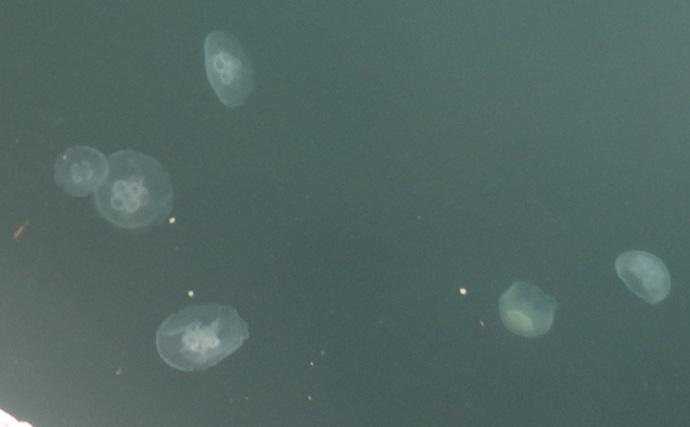 良い感じでアンダースローキャストを繰り返していくも、だんだんとアタリは遠のき、やがてフグ連チャン。足元のクラゲたちを見ると動いておらず、上げ潮が止まってしまったことが確認できる。