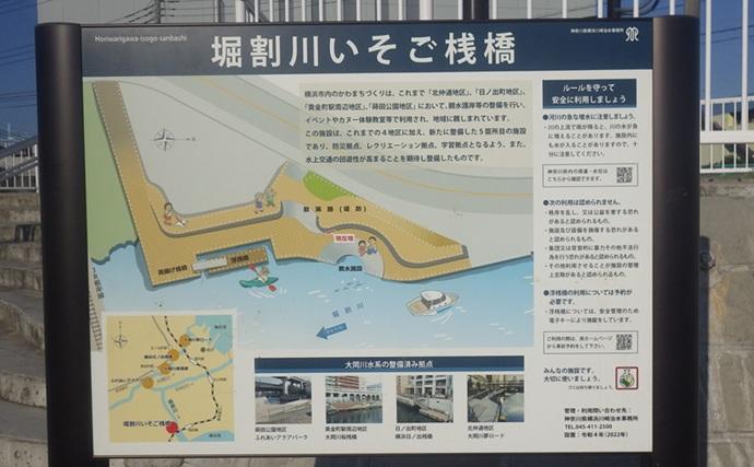 特に八幡橋より河口側近くは手前が極端に浅かったり、良さ気な所は立ち入り禁止エリアだったりと、あまり釣りに適しているとは言い難いイメージだったのですが、2022年に「掘割川いそご桟橋」という、釣りOKの親水公園が完成したという情報を受け、気になっていました。なので調査!