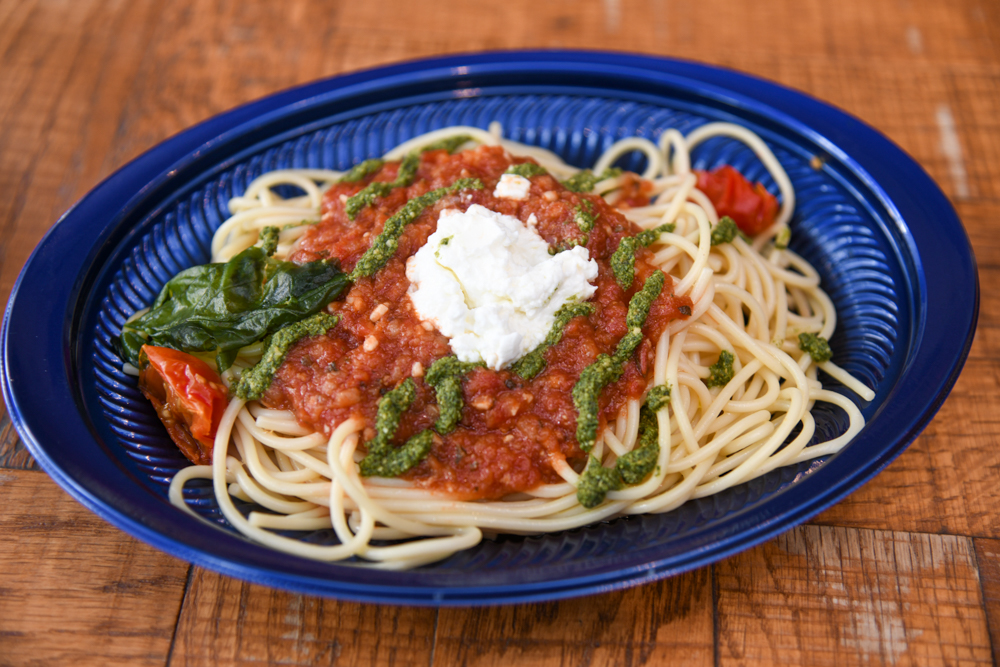 次に提供された『成城石井自家製 イタリア産リコッタチーズとバジルのトマトソースパスタ』は、パルミジャーノ・レジャーノを使ったトマトソースの上に自家製のジェノベーゼソースをかけ、リコッタチーズなどをトッピングしたパスタ。リコッタチーズを少しずつパスタに絡めていくことで味変が楽しめる一品だ。