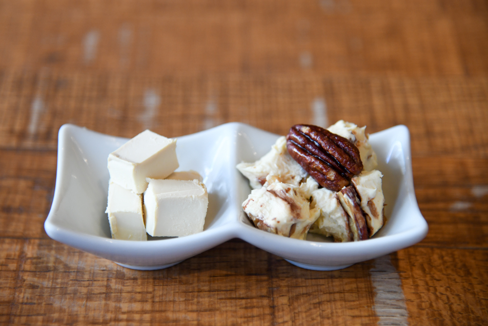 一方で、後者はキャラメルコーティングしたアーモンドとクルミをクリームチーズに混ぜ込み、メープルシロップをまとわせたピーカンナッツをのせたスイーツ感もある一品。「自社輸入のチーズを一部に使い、ピーカンナッツは自社でローストしたものを強い風味と香り高さが特徴のメープルシロップに絡めています」と小林さんは言い、仕入れ面に加え、3歩、4歩と加工の手間をかけているところに本フェアのこだわりが色濃く表れた商品でもある。2つ並べて供された一皿は、それだけでお酒が欲しくなる上品な佇まいだ。