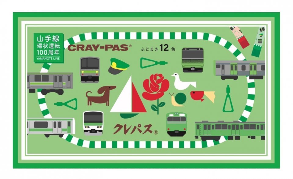 子供の頃から見慣れたオレンジ色の「クレパス」のパッケージが、山手線のグリーンに。環状の線路や車両のイラストも描かれた特別仕様。