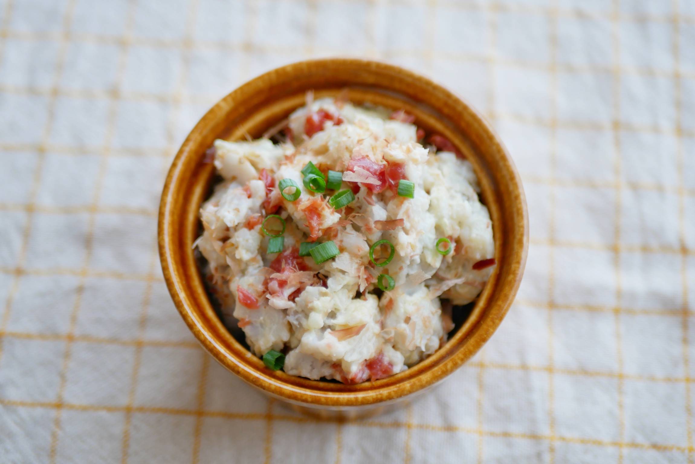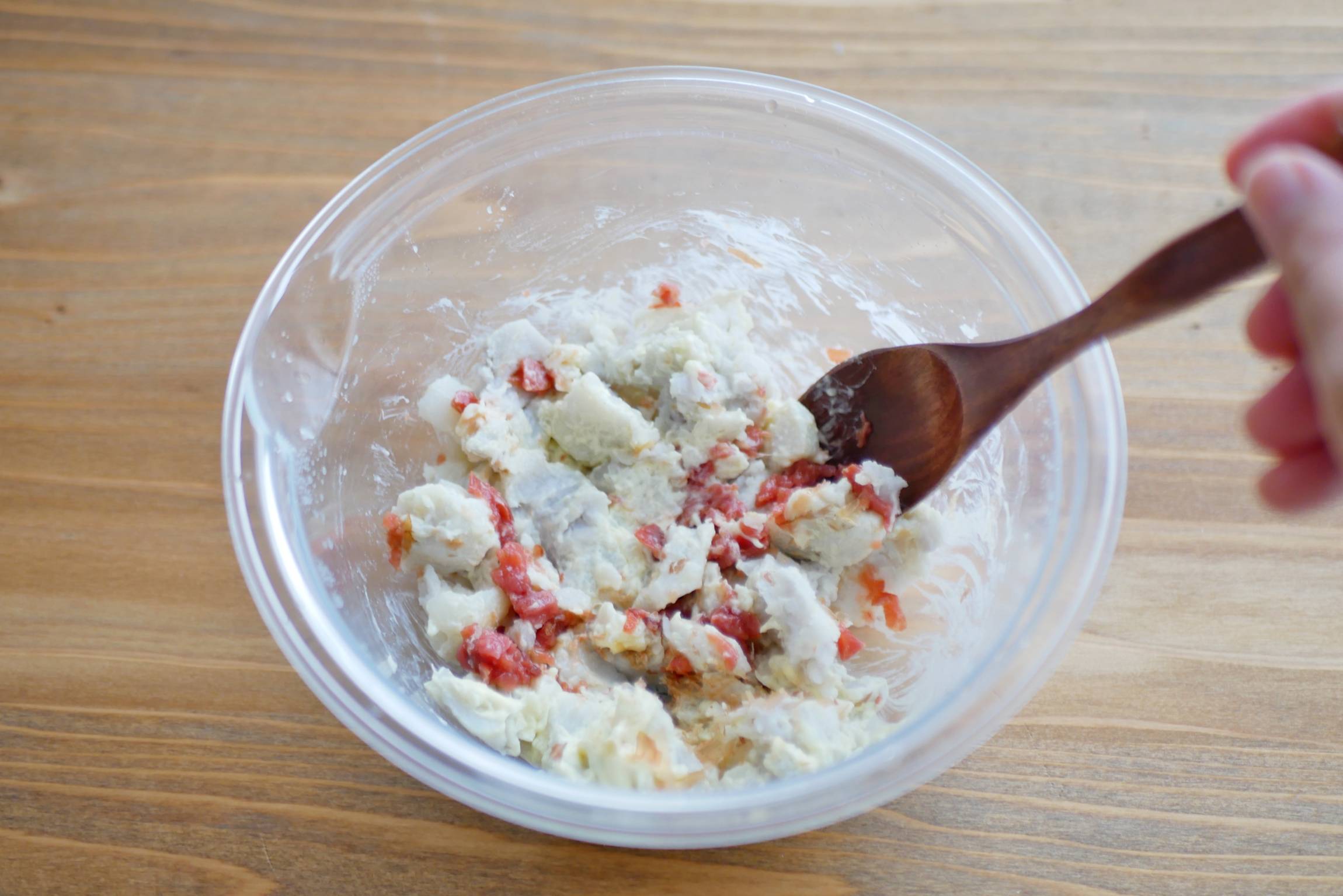 3にマヨネーズと梅干しを和え、かつお節を加えます。