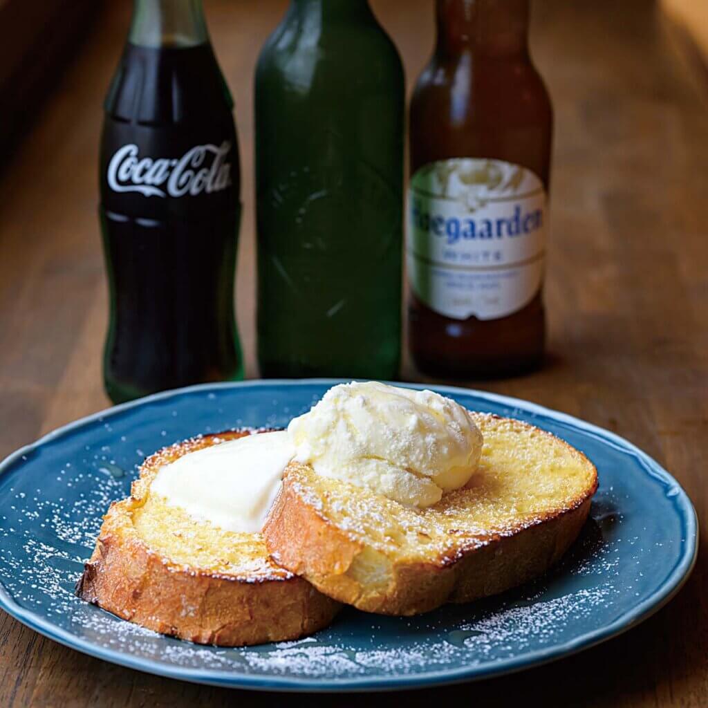 バニラアイスにメープルシロップをかけたフレンチトースト、MUZTNEフレンチ(800円)。