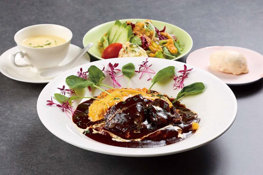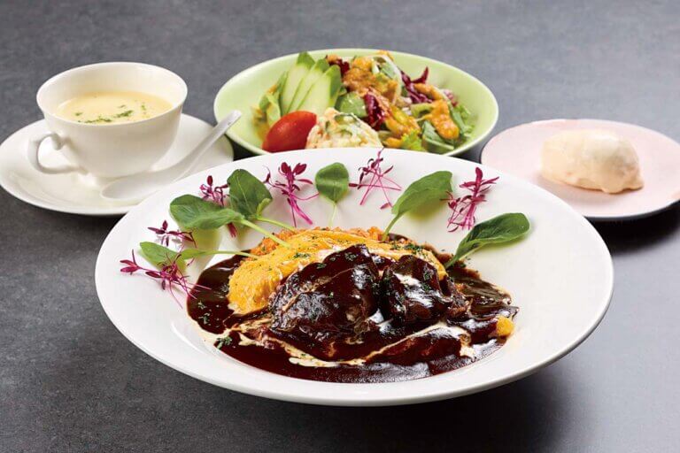 とろとろ卵のオムライス ビーフシチュー添え(1,980円)はスープやサラダ、アイスクリームが付き満足感◎。