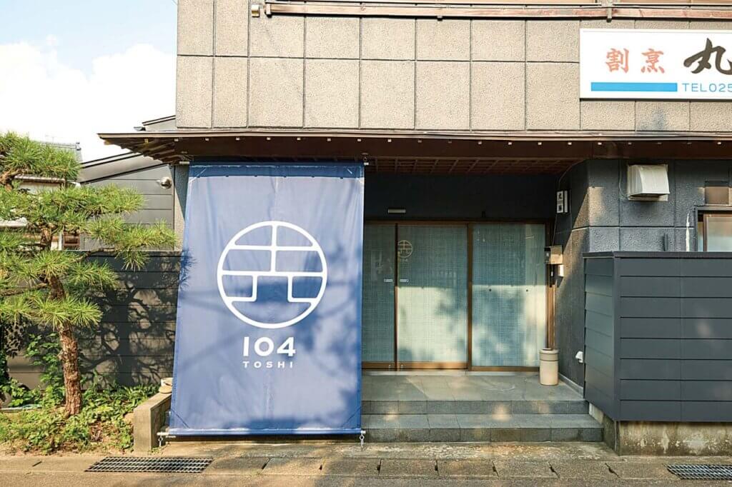 丸勝会館の1階、青いのぼりが目印。マークは店名である104の漢数字から着想し、作られたそう。