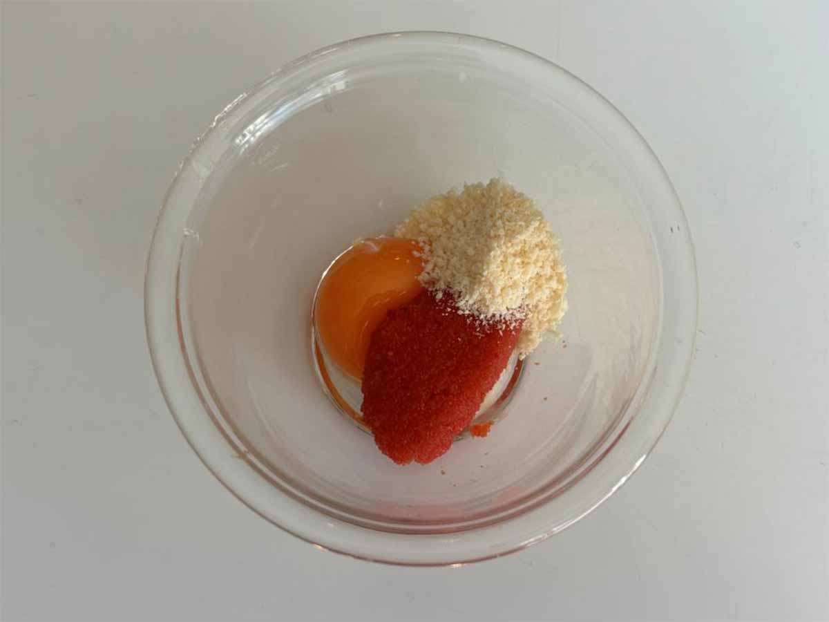①ボウルに卵黄、明太子、粉チーズを入れます。