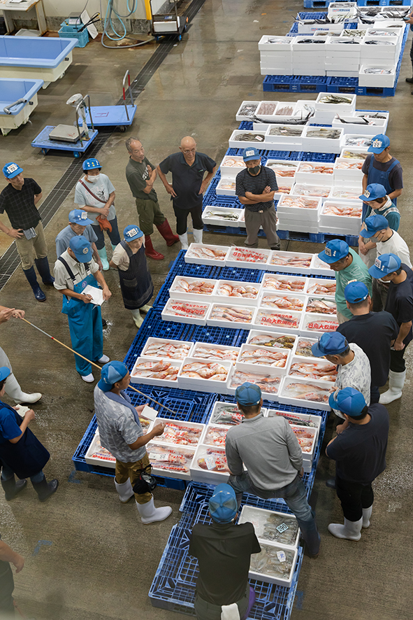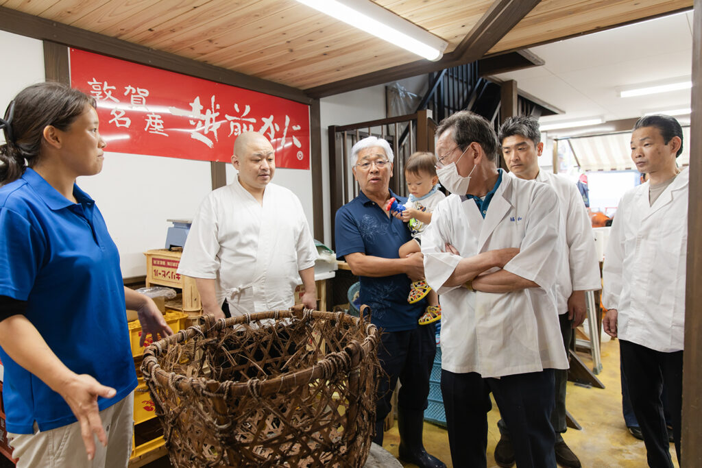 最初に訪れたのは、「越前かにの名付け親」として知られる敦賀市の相木魚問屋。敦賀水産卸売市場の目の前にあり、競りを終えたばかりの魚が次々と運び込まれていく。冬場は蟹一色となり、茹でたての湯気と香りが立ちのぼる光景が名物。料理人たちは真剣な眼差しで魚を見つめながら、その新鮮さと活気に心を奪われていた。