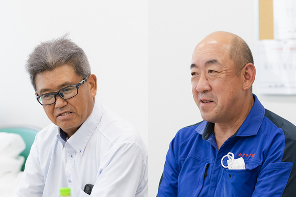 「若狭牛の脂はくどくないのが特徴。豚や鶏などの銘柄肉もアピールしたい」とホクチクの玉村純一さん(左)と農中洋一さん(右)。