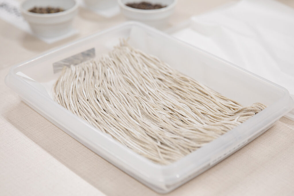 そば処・福井で代々石臼挽きで製粉を行うカガセイフンは創業140年。「福井のそばは、雑駁だけど複雑な旨みが特徴」と語る代表の加賀健太郎さん。加賀さん自ら手打ちしたそばを試食し、力強い香りと舌触りに、風土がそのまま息づいていることを実感した。