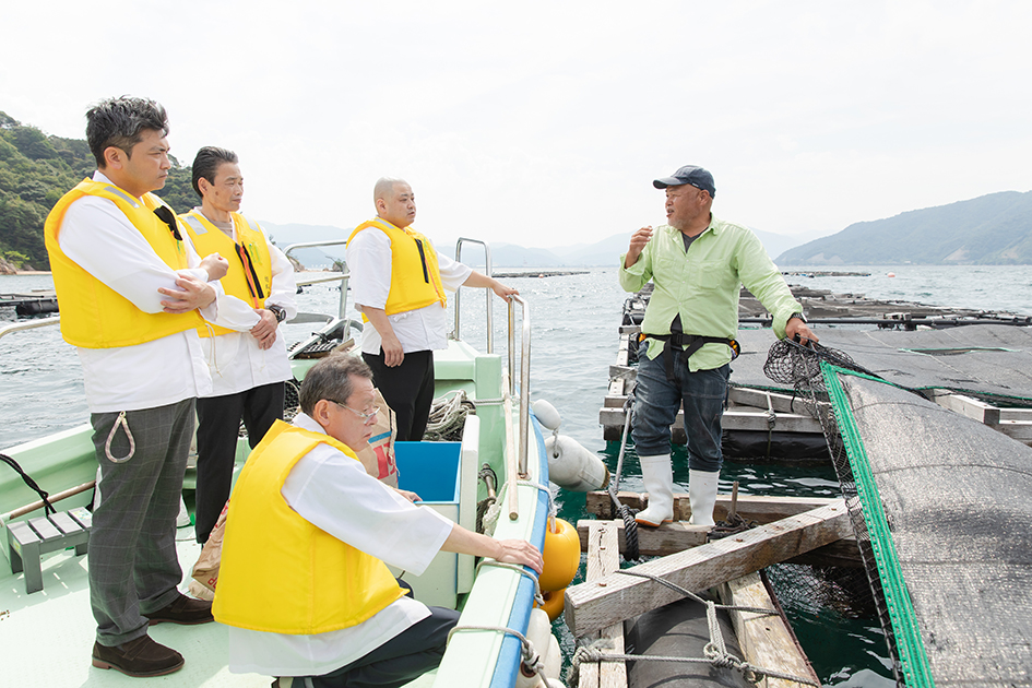 敦賀湾で船に乗り、身質の良さに定評のある「若狭ふぐ」「敦賀真鯛」「若狭まはた」の養殖現場を見学。「低水温期が長く、時間をかけて育てることで天然魚に匹敵する味わいになる」と中村英樹さん(福井県海水養魚協会会長)。