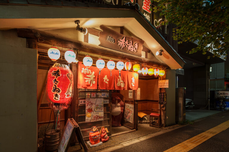 越乃赤たぬき 弁天店は昔懐かしい雰囲気の居酒屋として親しまれ、幅広い客層がひっきりなしに訪れます。