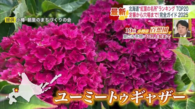 桜やアジサイで知られる百想園では、9月下旬からアジサイの一種“ユーミートゥギャザー”が真っ赤に色づき、紅葉します。