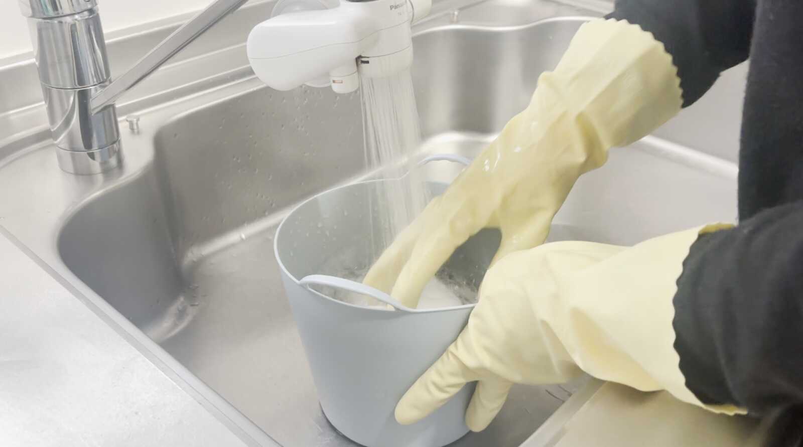 つけ置き後は、塩素成分が残らないよう流水でよくすすぎます。布巾を軽く押しながらすすぐと、繊維に残った液が抜けやすくなります。