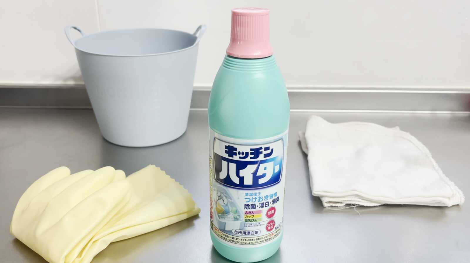 バケツに2Lの水を入れ、キッチンハイター(液体タイプ)をキャップ半分ほど(約12mL)加えて薄めます。