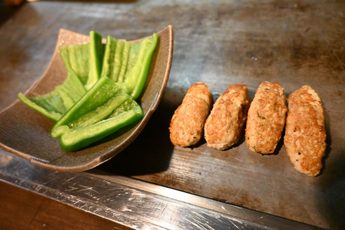 店主おすすめのメニュー「生ピーマンとつくね」もいただきます。焼き鳥屋さんに負けないくらい、何度も試行錯誤して研究しているのだそう。