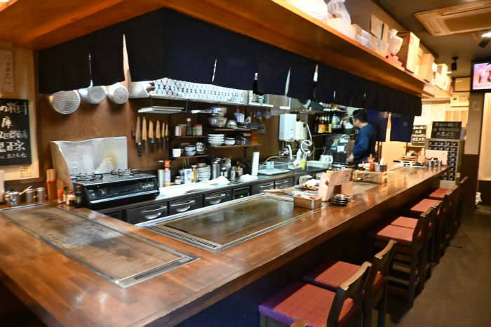 店内はカウンター12席、奥にテーブル席が1つ(6人掛け)。鉄板が目の前に並び、臨場感たっぷりの料理が楽しめます。
