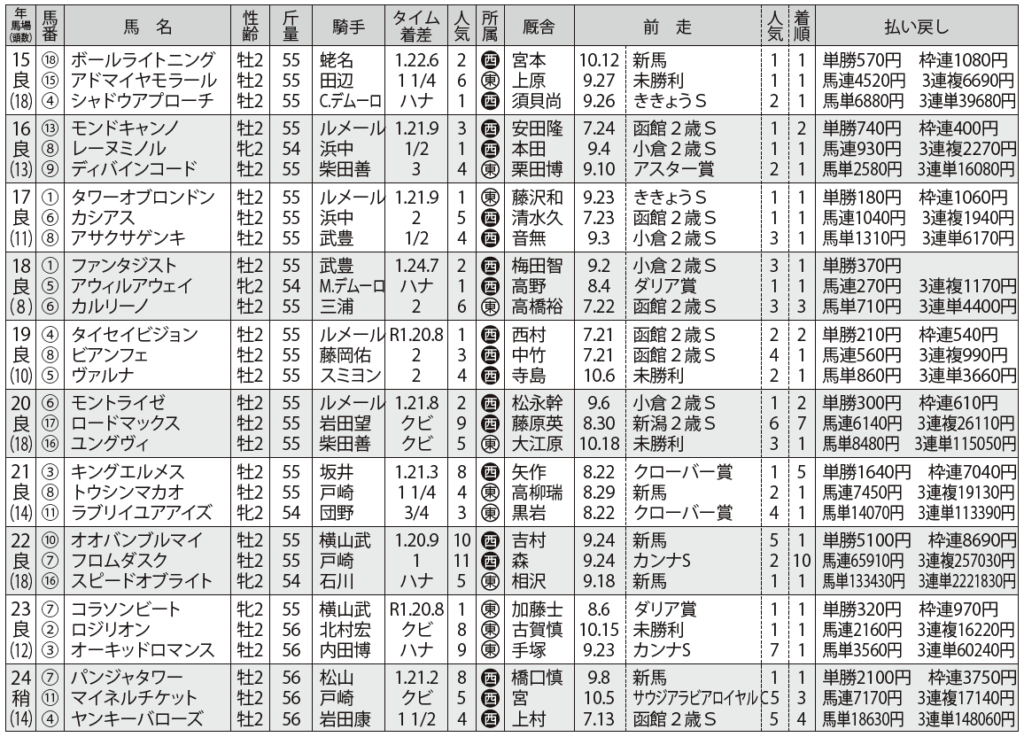 記憶に新しい24年は⑪番枠の⑤人気マイネルチケットが2着に入っている。多頭数の年は2桁馬番の馬から高配当狙いが得策。