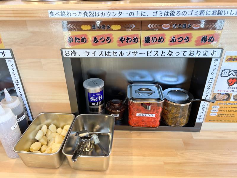 卓上には一味、ブラックペッパー、高菜、紅ショウガ、いりごま、ニンニク、タレ(かえし)が置かれています。味変バリエーションは申し分なしです。