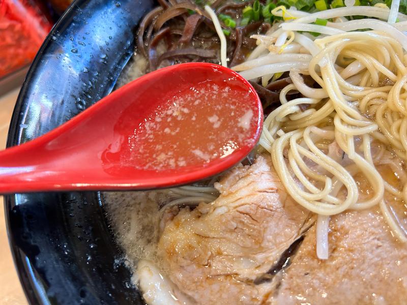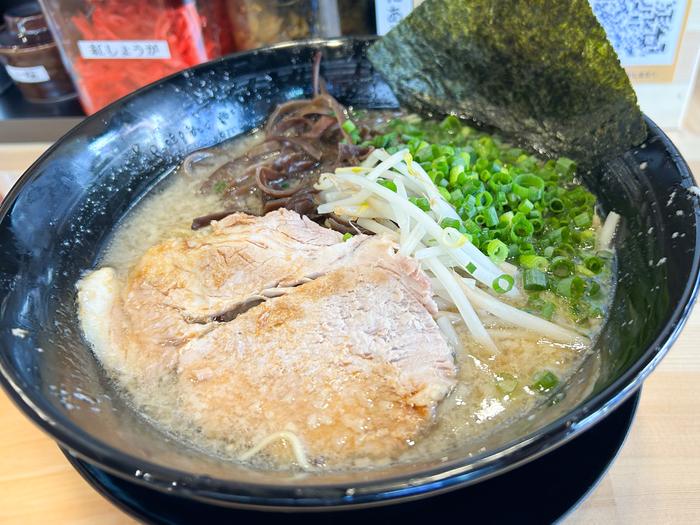 今回は『とんこつラーメン(1,100円)』を注文。きくらげとネギは無料で大盛にしました。チャーシュー、もやし、きくらげ、ネギの王道トッピング。見た目からボリューム感があります。