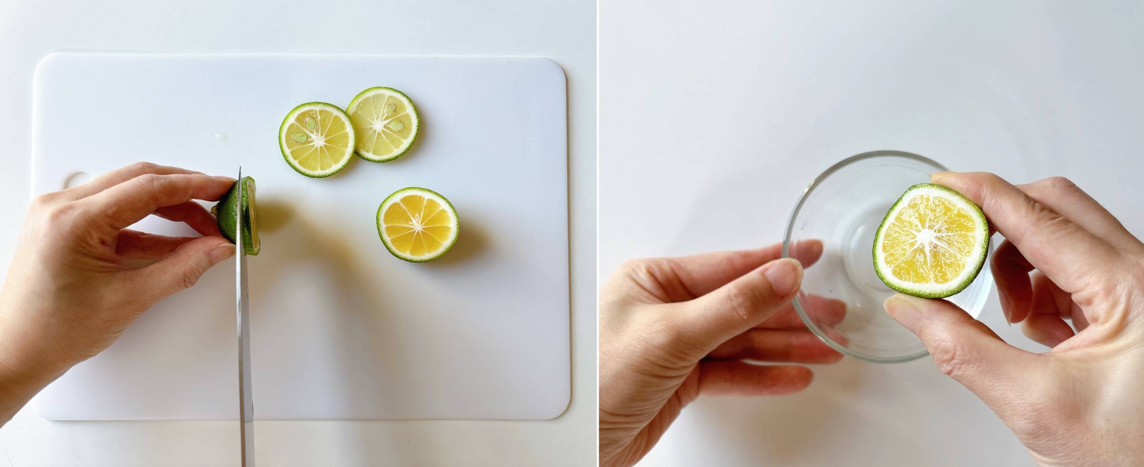かぼすは半分にカットし、皮を下にして搾ります。皮を下に搾ることで、皮の香りも一緒に摂ることができるうえ、種が落ちません。