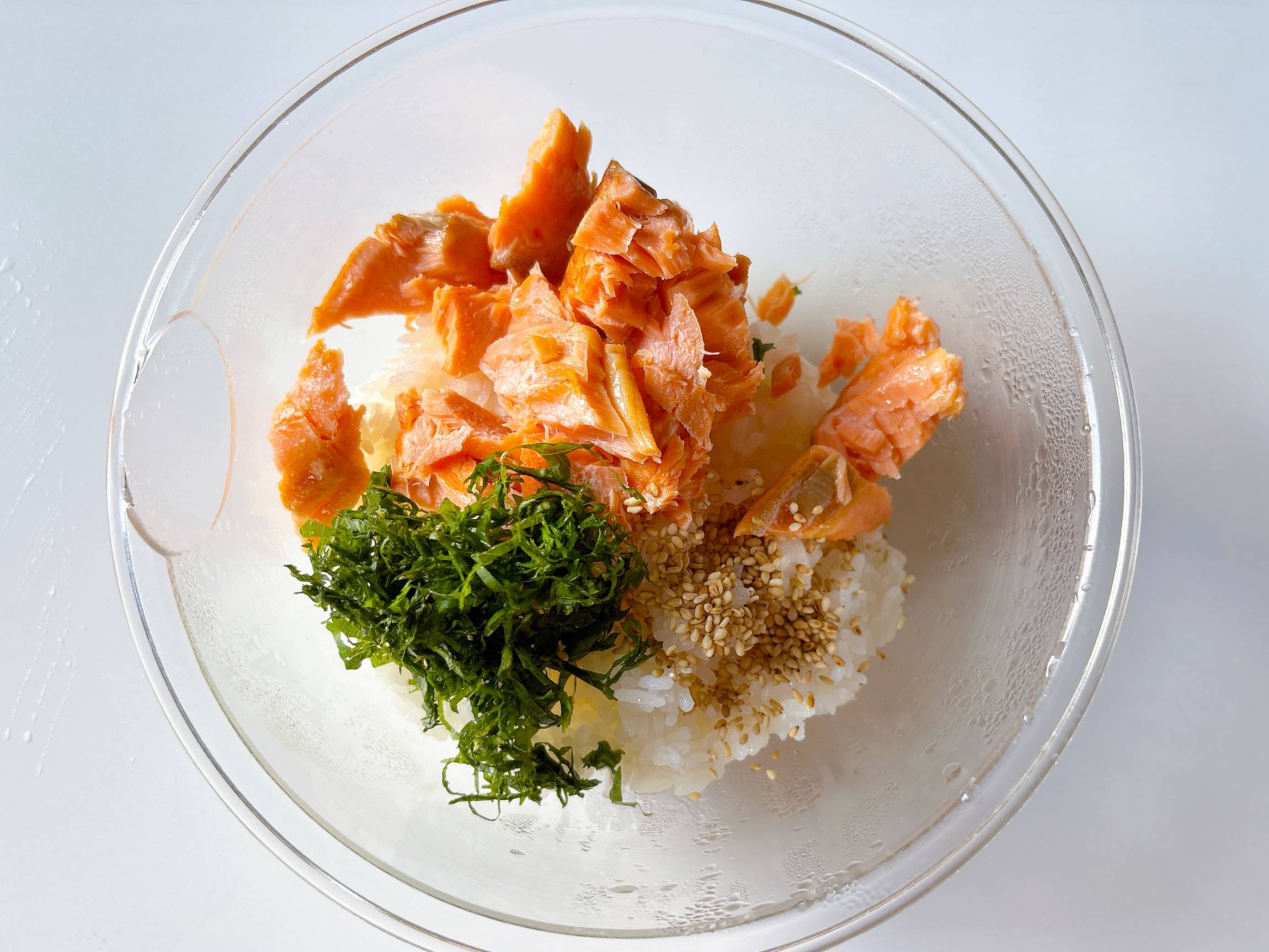 ごはんと鮭、薬味を混ぜる