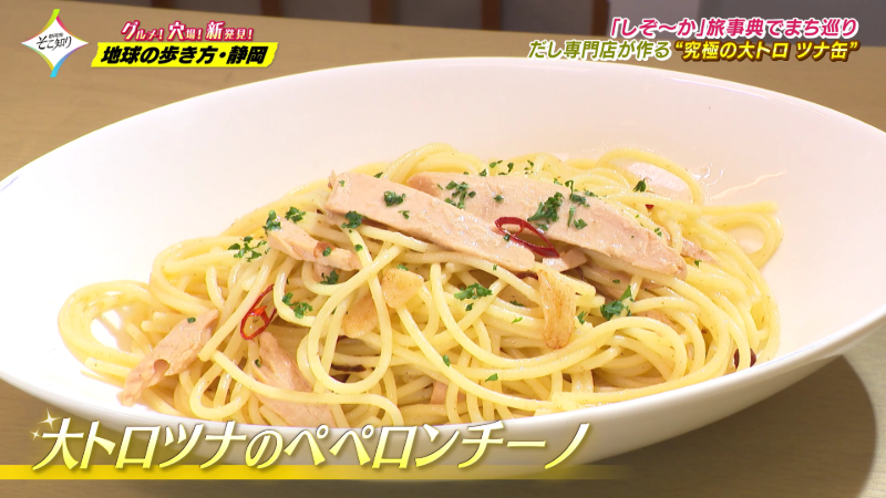 「勝男屋」の出汁に大トロのツナを贅沢に乗せた『ペペロンチーノ』。