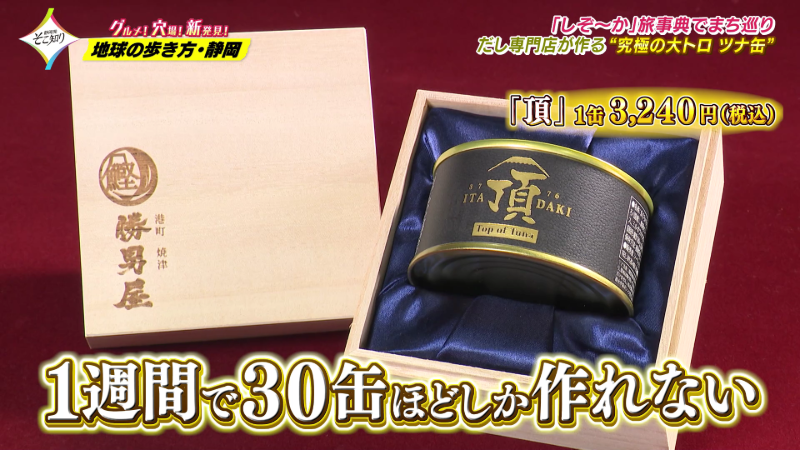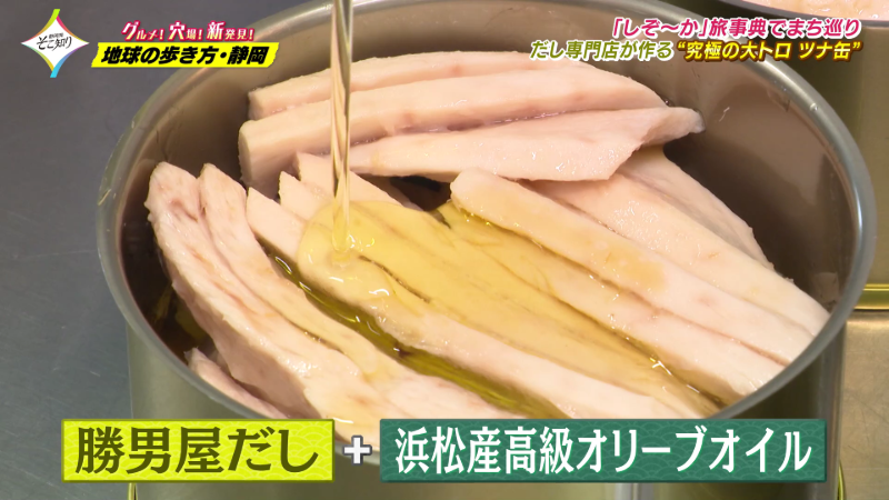 「勝男屋」の出汁で作った調味液と浜松にあるオリーブ園で作られた高級オリーブオイルをたっぷりと入れ、すべて手作りのため一週間で30缶ほどしか作れない幻の缶詰と言われています。
