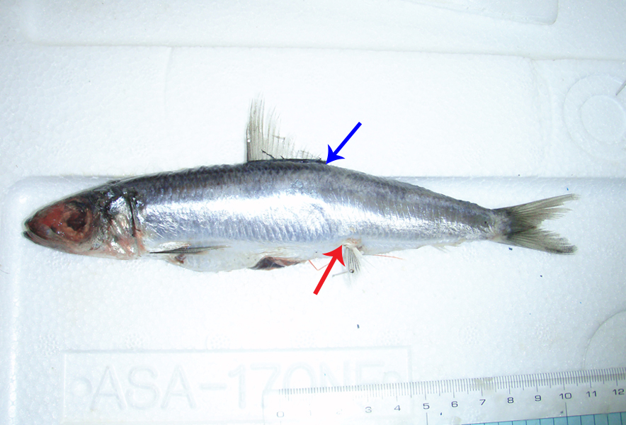 ウルメイワシの特徴は背鰭と腹鰭の位置関係で、多くの日本産ニシン科魚類では背鰭のすぐ下に腹鰭がありますが、ウルメイワシの腹鰭(赤い矢印)は背鰭基底の後端(青い矢印)よりも後方にあることにより、容易に見分けることができます。