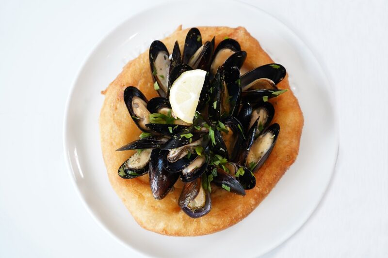 ピッツァは定番の「マルゲリータ」(1,500円)をはじめ、今が旬の博多ナスとボロネーゼを合わせた「ピッツァランディック」(2,000円)、厳選した4種のチーズが香る「クワトロフォルマッジ」(2,500円)の3種に加え、今回は揚げた生地が香ばしいナポリ発祥のピッツァ「モンタナーラ」が初登場。牛肉や豚のスペアリブをじっくり煮込んだ「モンタナーラ ナポリラグー」(2,000円)とムール貝の旨みたっぷり、見た目もインパクトありの「モンタナーラ ペスカトーレ」(2,500円)の2種があります。揚げピッツァの生地は外はカリッと中はふんわりモチッとしていて、香りや食感、ソースとの絡み具合など、窯焼き生地とはひと味違った味わいなので、ぜひ食べ比べてみて!
