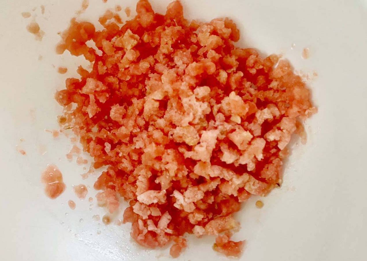 冷凍トマトの皮をむいて、おろし金ですりおろします。冷凍トマトは少し水に浸けると、簡単に皮がむけます。