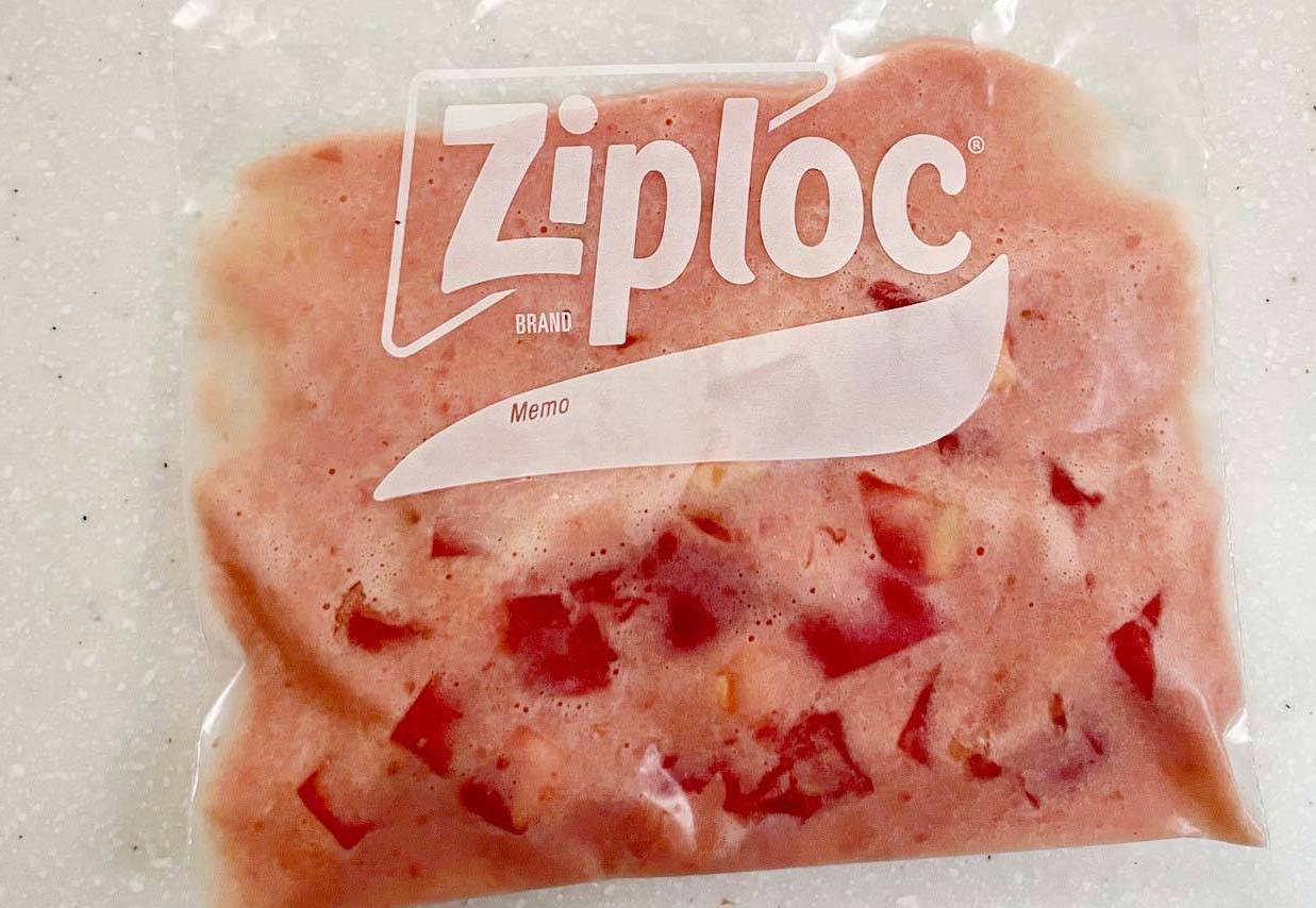 角切りトマトを混ぜ、袋に入れて凍らせる
