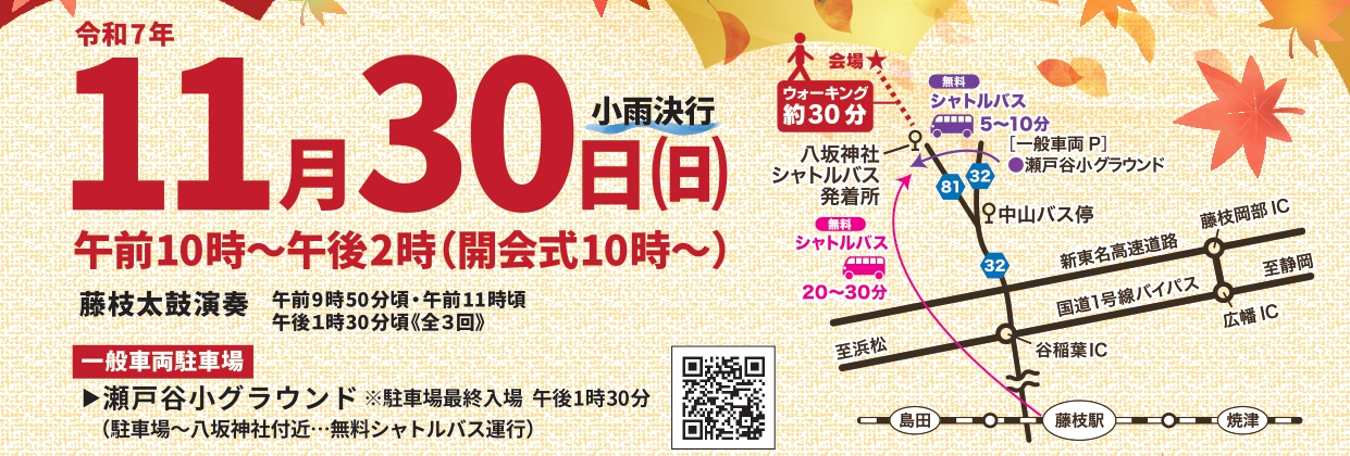 ・無料シャトルバス:JR藤枝駅南口〜八坂神社まで運行。