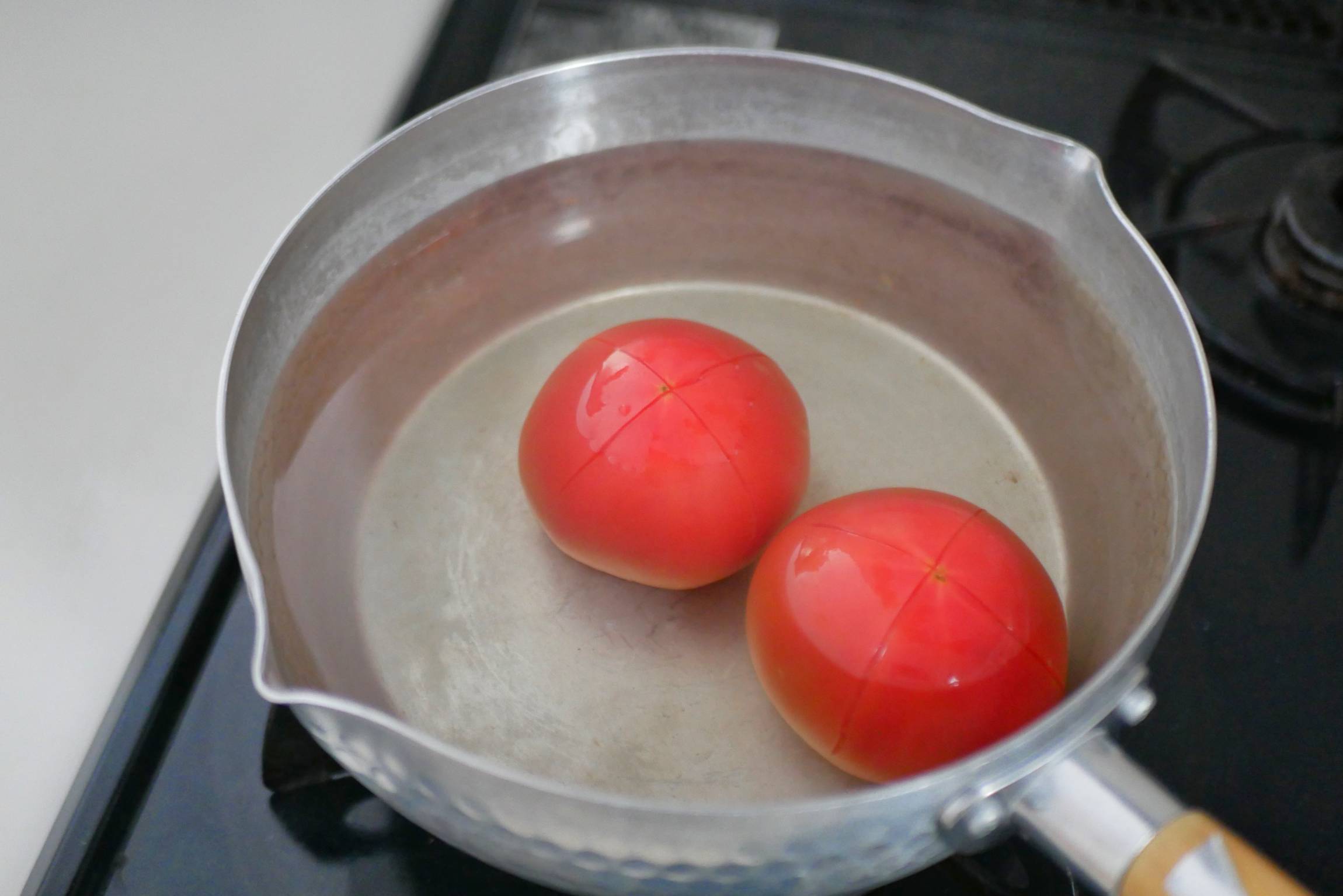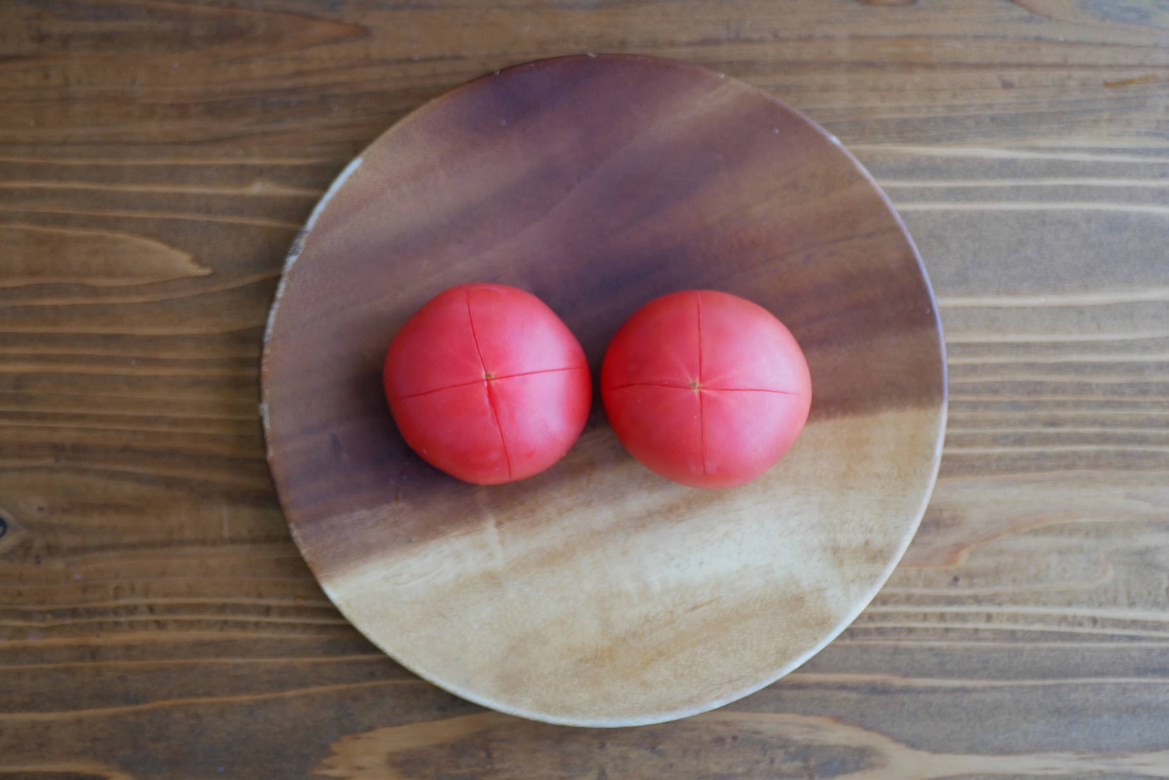 トマトはヘタをとり、おしりに浅く十字の切れ込みを入れます。