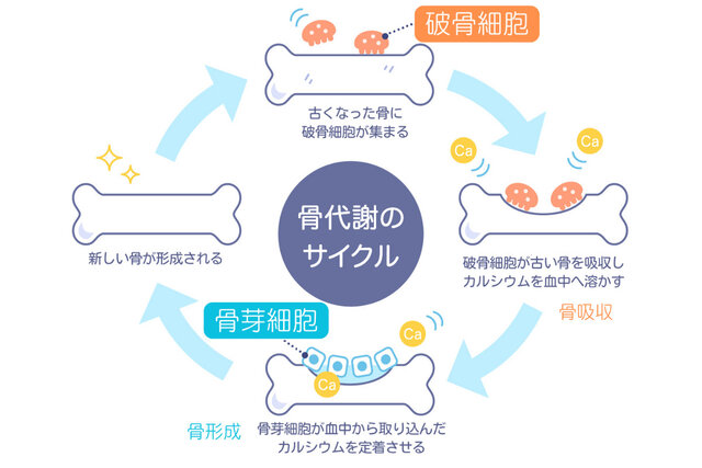 伊藤先生:骨は常に新陳代謝を繰り返しています。骨には、骨を新しく再生するために古い骨を溶かしてカルシウムを血中に流す「破骨細胞」と、血中のカルシウムを取り込み、骨に定着させることで新しい骨に作り直す「骨芽細胞」があります。