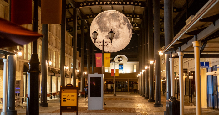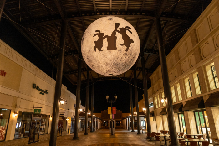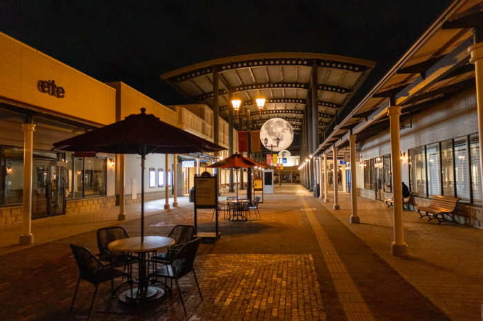 営業が終了した深夜のアウトレットに足を踏み入れ、多彩な飲食店が軒を連ねる『フードギャラリー』へ向かうと、まもなく宙に浮かぶ立派なお月様が目に飛び込んできました。