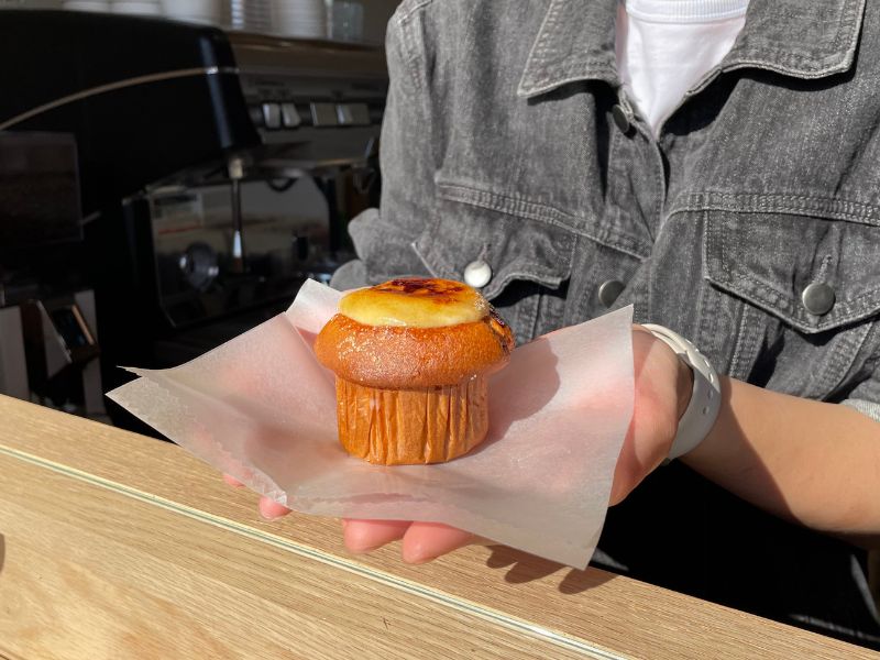 栗田さんのおすすめは、マフィン × ラテ。ラテには少し濃いめのミルクに合うエスプレッソを選んでいて、米粉マフィンの優しい甘さを引き立てる味わいです。