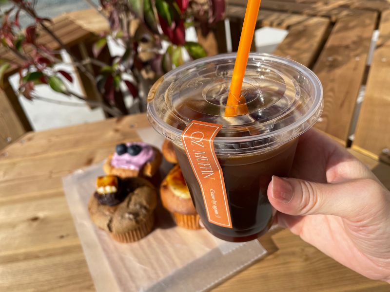 今回は、マフィンと一緒にアイスアメリカーノを。ほどよい苦みと軽やかな口当たりで、甘いマフィンと相性抜群でした。