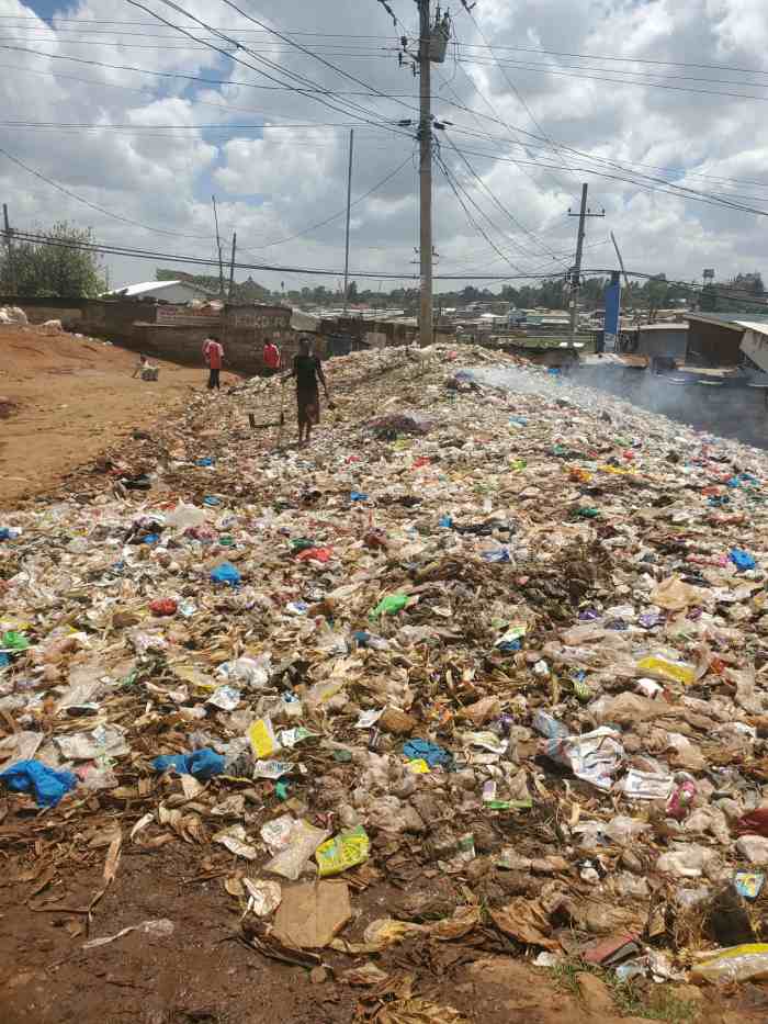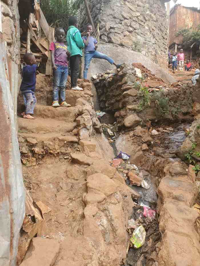 キベラスラムには整備された下水道がなくて、生活排水が流れる溝(ドブ)はフタもなくむき出しの状態だ。そこにはトイレからの汚水(おしっこなど)も垂れ流しになっている。