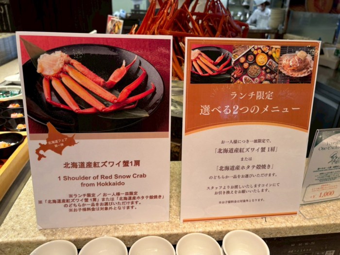 今回は選べるお一人様一皿限定メニューがあり、ランチタイムは「北海道産紅ズワイ蟹1肩」か「北海道産ホタテ殻焼き」が選べる。