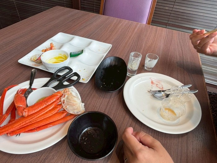 と思って、戻ってきたら、こぐまちゃんはもう皿がほぼ空になっていた。……いや、早くない? たぶん2〜3分しか経ってない。(カニは待っててくれたのね)
