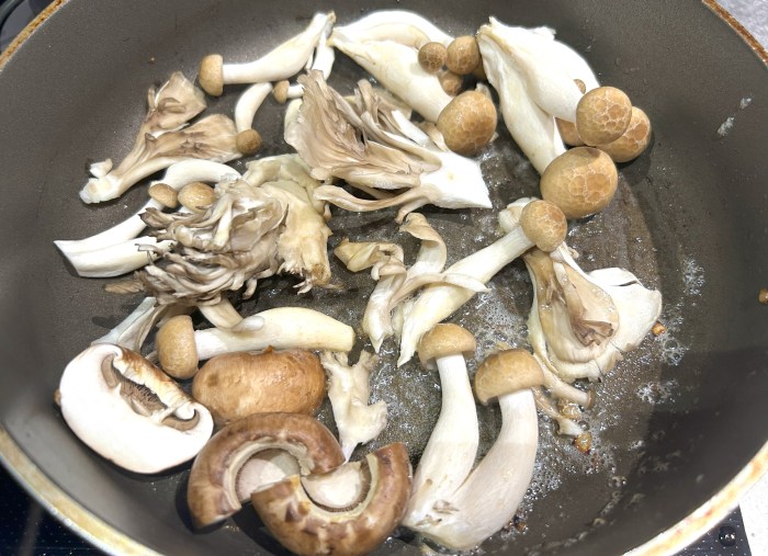 肉の旨味もソースに移った方が良いかと、油だけサッと拭き取りフライパンは洗わずにバターを落とす。そこでマッシュルームにしめじ、マイタケを炒めてみることにした。