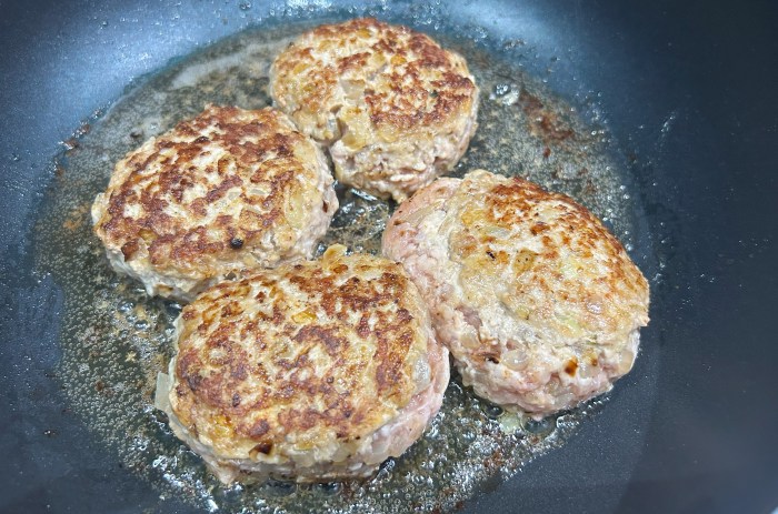 まずは至って普通のハンバーグを作っていく。ひき肉とタマネギパン粉に卵を混ぜて、こねこね。食べやすい大きさに形成したタネをフライパンで焼き、火が通ったところで皿に取り出す。