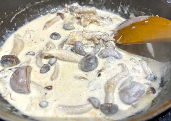 十分に炒めた後、きのこが漬かるくらいの白ワインを投入する。グラグラしてきたところで生クリームを200mlほど注ぎ、コンソメのようなコクもあったような気がするのでキューブを入れる。