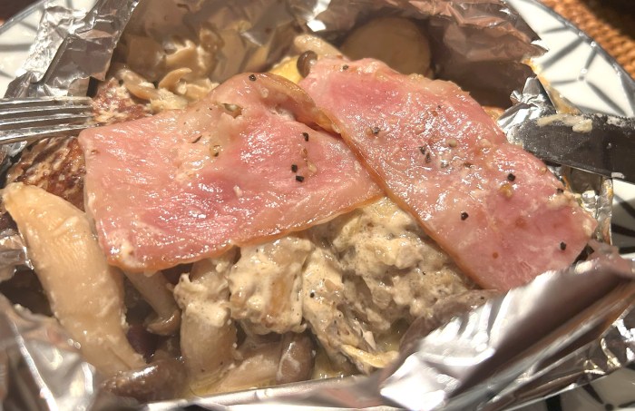若干不安を覚えながら、ココスに倣ってアルミホイルでこれらを包みレンチンしたサツマイモとベーコンを乗せ、200度で余熱したオーブンに入れる。すべてに火が通っているので、10分程度で良いだろうか。