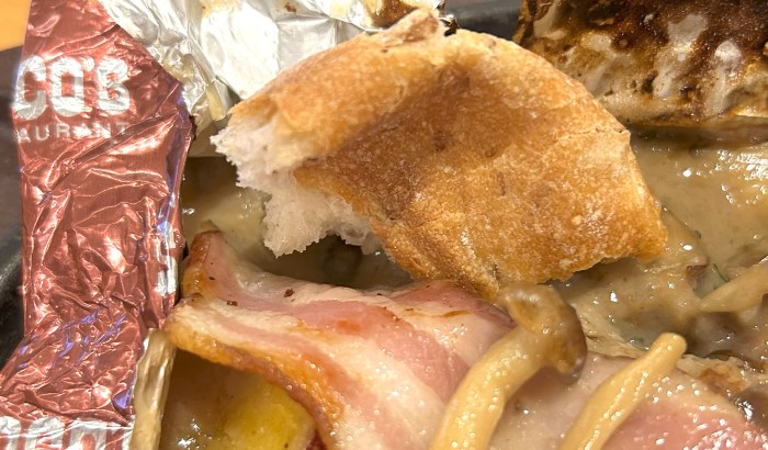 ハンバーグの肉感に、ベーコンがプラスされて食べ応えも十分。ソースとの相性も悪くない。そこそこ良いセンを行っていると思うが、しかしちょっと、惜しさもある。