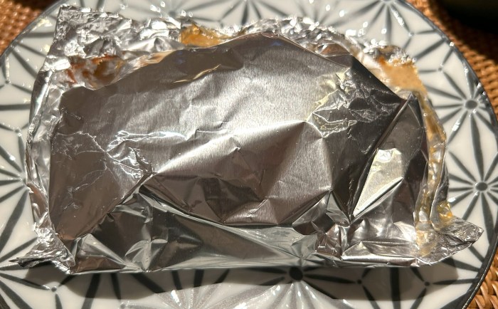 ソースがアルミホイルからこぼれたら嫌だなと控えめに入れてしまったのだが、思い切ってたっぷり入れるべきであったか。本家に比べて、クリーミーさが足りないのだ。